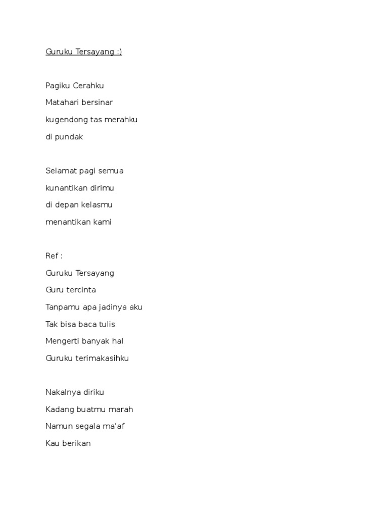 Di rumah kamu bisa memainkannya dengan piano maupun pianika guys tanpa kendala. Demikian ulasan terkait lagu terima kasih guruku ena voice yang bisa admin jabarkan. LIRIK LAGU GURUKU TERSAYANGGURUKU TERCINTAPagiku cerahkuMatahari bersinarKugendong tas merahku di pundakSelamat pagi.