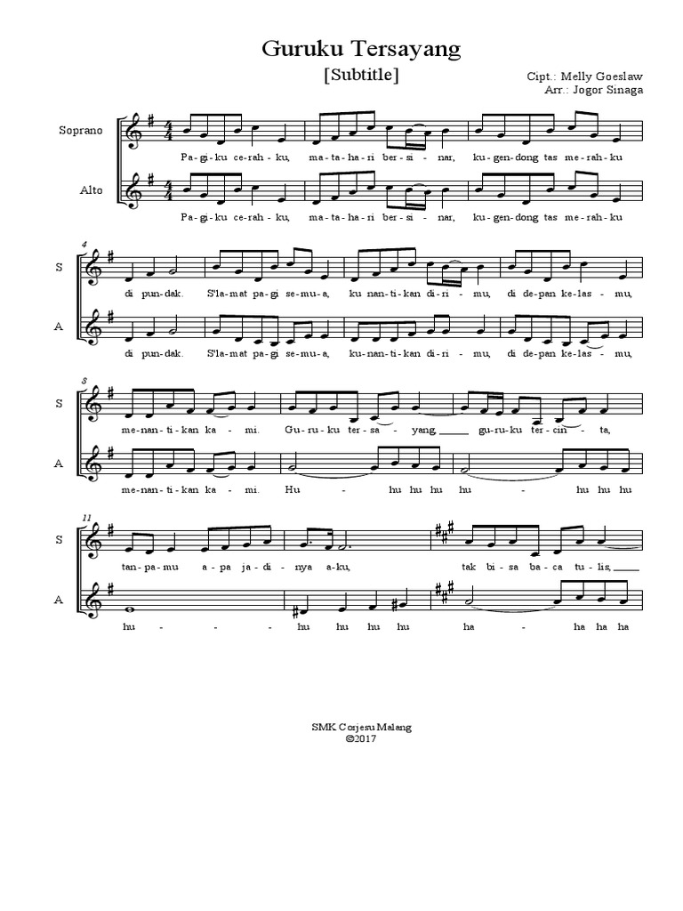 Lagu Guruku Tersayang merupakan salah satu lagu yang diciptakan oleh Melly Goeslaw. Sienty Ayu Monica -. Melly Goeslaw - Guruku Tersayang Intro C F G C C F G C Verse 1 C F Pagiku cerahku G C Matahari bersinar C F Kugendong tas merahku G GB C Di pundak C F Slamat pagi semua G C Kunantikan dirimu C F Di depan kelasmu G C Menantikan kami Chorus Am F Guruku tersayang.